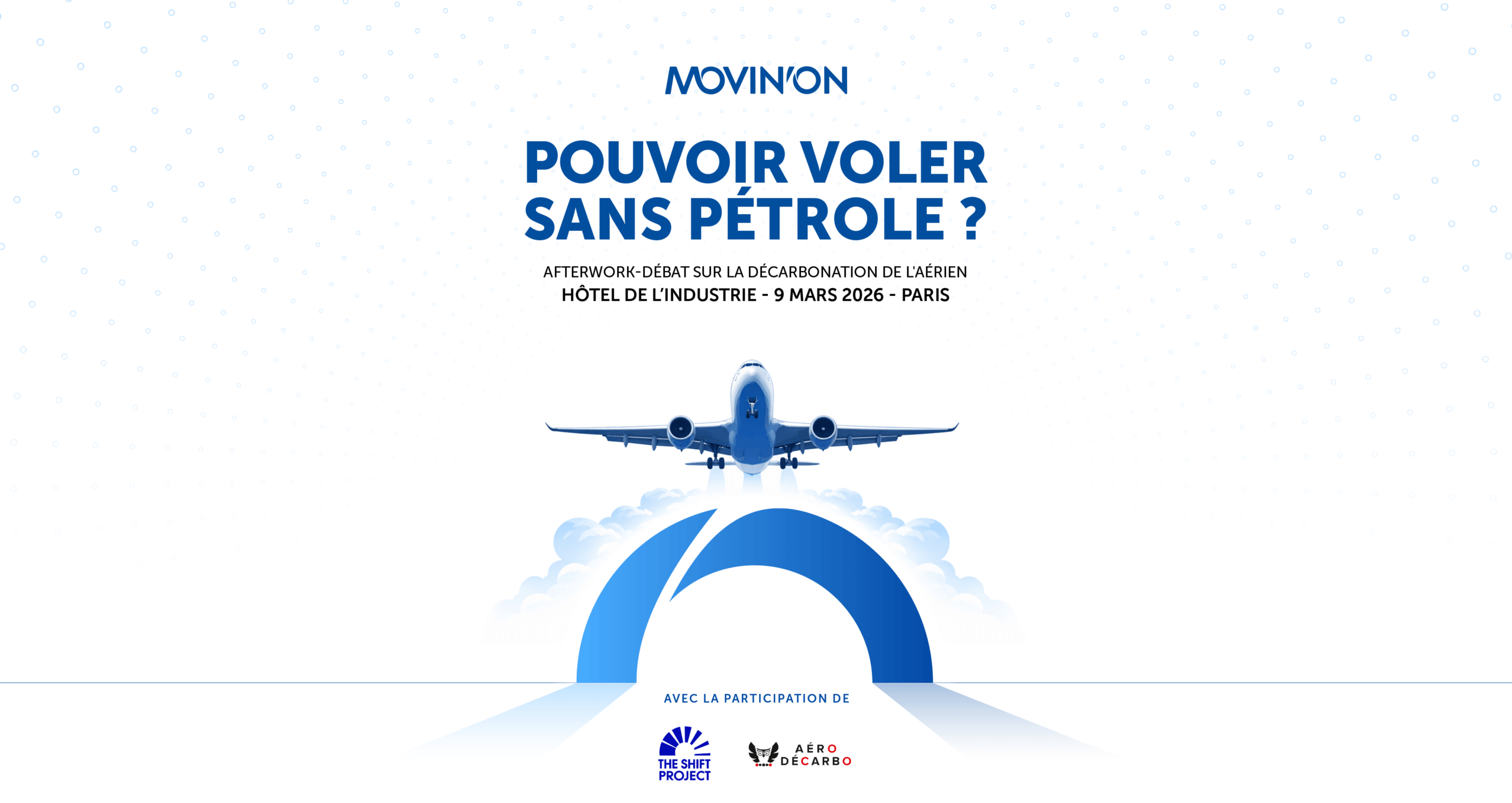 À l’occasion de la publication du rapport « Pouvoir voler sans pétrole » (Aéro Décarbo x The Shift Project, publié le 3 février), Movin’On vous invite à dénouer ces enjeux complexes le 9 mars prochain de 18h30 à 22h à l’Hôtel de l’Industrie, Place Saint-Germain des Prés à Paris.